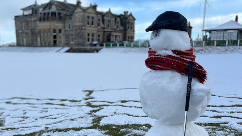 We’ve seen St Andrews and far more southern-lying courses blanketed in snow before, but we can’t recall seeing snowmen, especially not perched on one of the most iconic stretches of grass in golf.