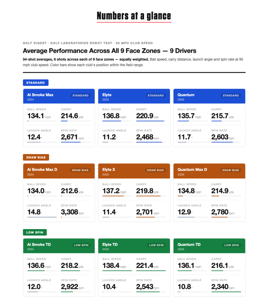 Before diving into specific metrics, it’s worth establishing where each model sits on the four numbers golfers care about most: ball speed, carry, launch angle and spin rate. These are the baselines against which everything else gets measured.