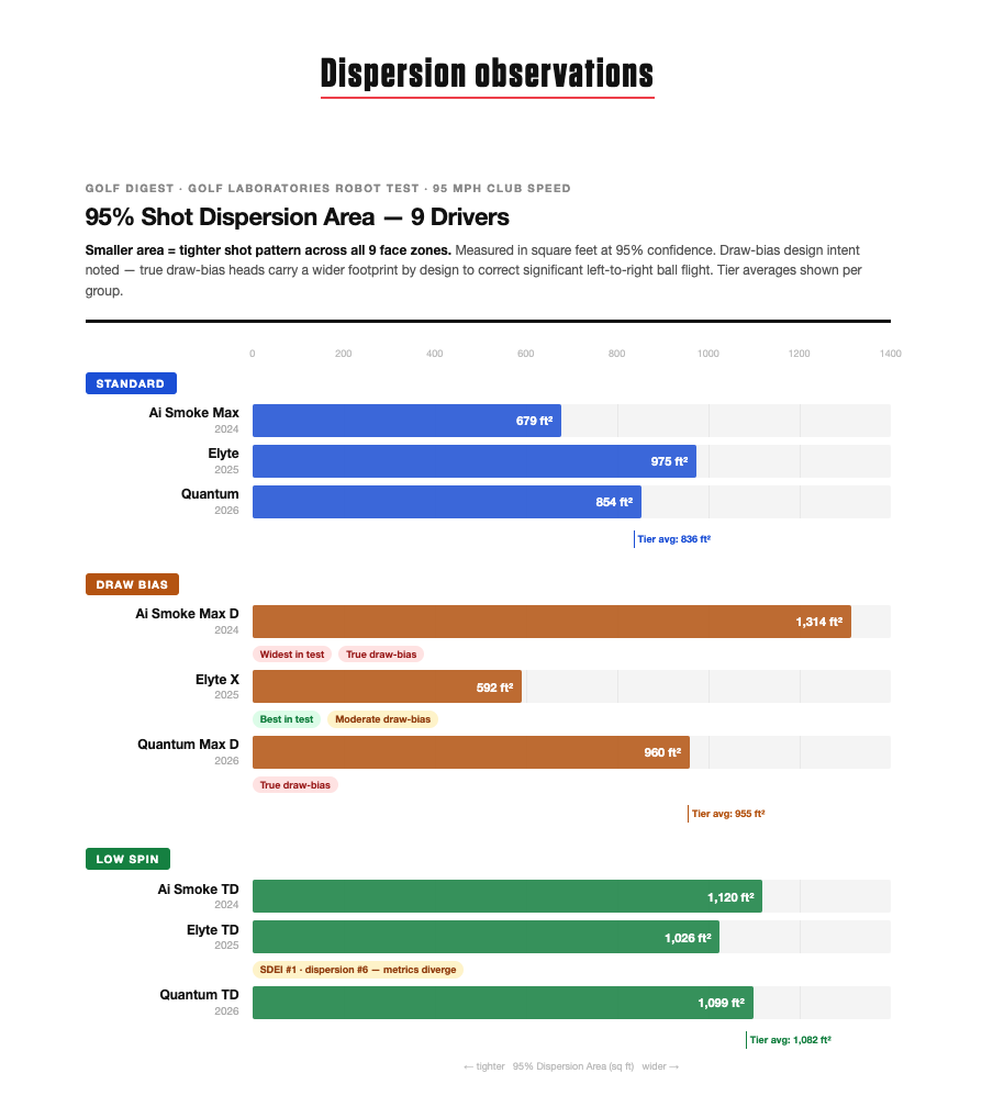 Not all dispersion numbers mean the same thing. The Ai Smoke Max D’s 1,314 sq ft looks alarming next to the Elyte X’s 592 sq ft. But those two clubs aren’t built for the same golfer or the same miss.