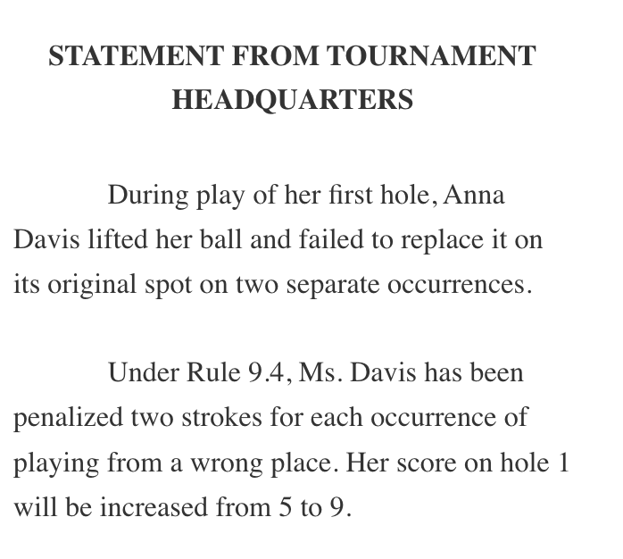 Golf Channel reported that Davis was informed of the possible rules issue on the fourth tee. She then double bogeyed that hole and suffered another bogey at the fifth. But Davis rallied with three birdies over her next seven holes and was tied for 18th place—without the penalties—with five holes to play.