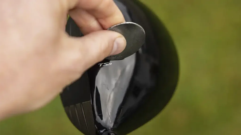 If the club is supposed to have a carbon crown, tap a coin on it [above]. If it rings like a bell, you’ve been had. Only titanium or stainless steel will ring. If the seller says the club is titanium and a magnet clings to it, it’s a fake. Magnets don’t stick to titanium. Finally, smell the grip: counterfeiters often use cheap rubber that has a pungent odour.