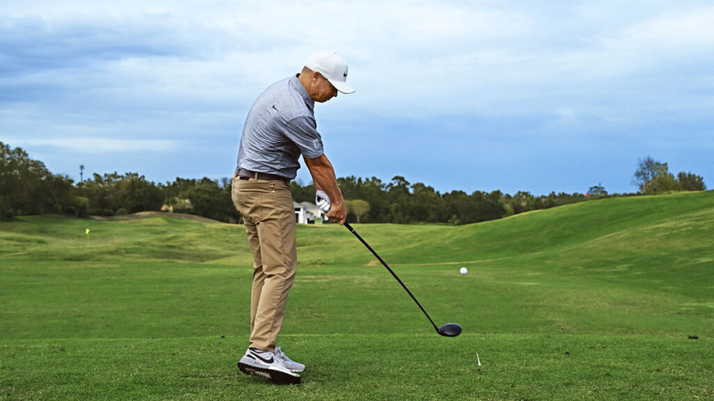 Many amateurs sacrifice distance by thinking they need to swing down hard into the ball at the start of the downswing. This notion typically leads to the driver slowing down as it meets the ball. There’s no snap-like action through impact. What you want to do is think about having the club moving its fastest at the ball or even after it. Think of it like you’re sneaking up on the ball. Your driver should initially start down on a slower, unhurried pace with a feeling that your arms are simply falling. As the club nears the ball, that’s when you step on the pedal – literally pushing into the ground to get that acceleration in the right place.