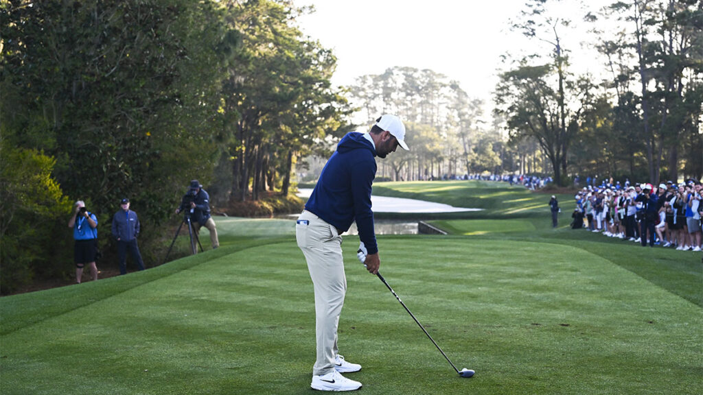 1: Scheffler stands in an upright posture with a slight flex and his arms angled out away from his body. His weight is towards the balls of his feet.