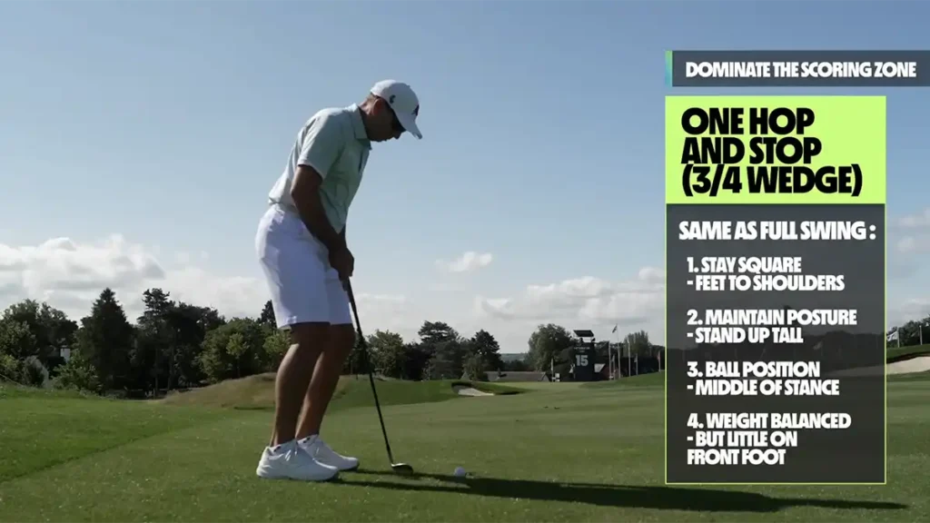 Whenever I’m not hitting a full shot, everything is a little bit ‘tighter’. I like my stance to be a little bit narrower (the ball is still in the middle of the stance with this shot), although I’m still doing the same things I do with a full shot. I’m still making sure that I’m set up square, that my posture is still the same and my weight is a bit more on the left leg. But I’m going to grip it a tiny bit shorter down the handle and my feet are a bit closer together because I don’t need to make a full swing. These adjustments help prevent me from making a full swing. They shorten my swing a little bit, and that’s what I need for this kind of shot.