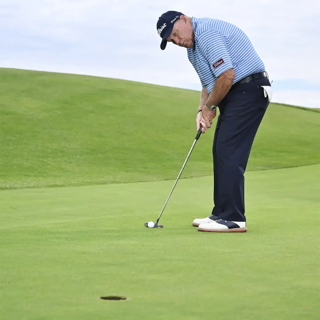 The first thing you need to do is aim the face before you take your stance. Many players take their stance and then just plop the putter down behind the ball. The line on breaking putts is crucial, so point the face where you want the ball to start, then build your stance. I don’t care if you stand square, open or on one leg – the face is the key.