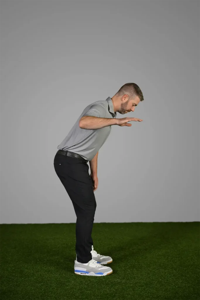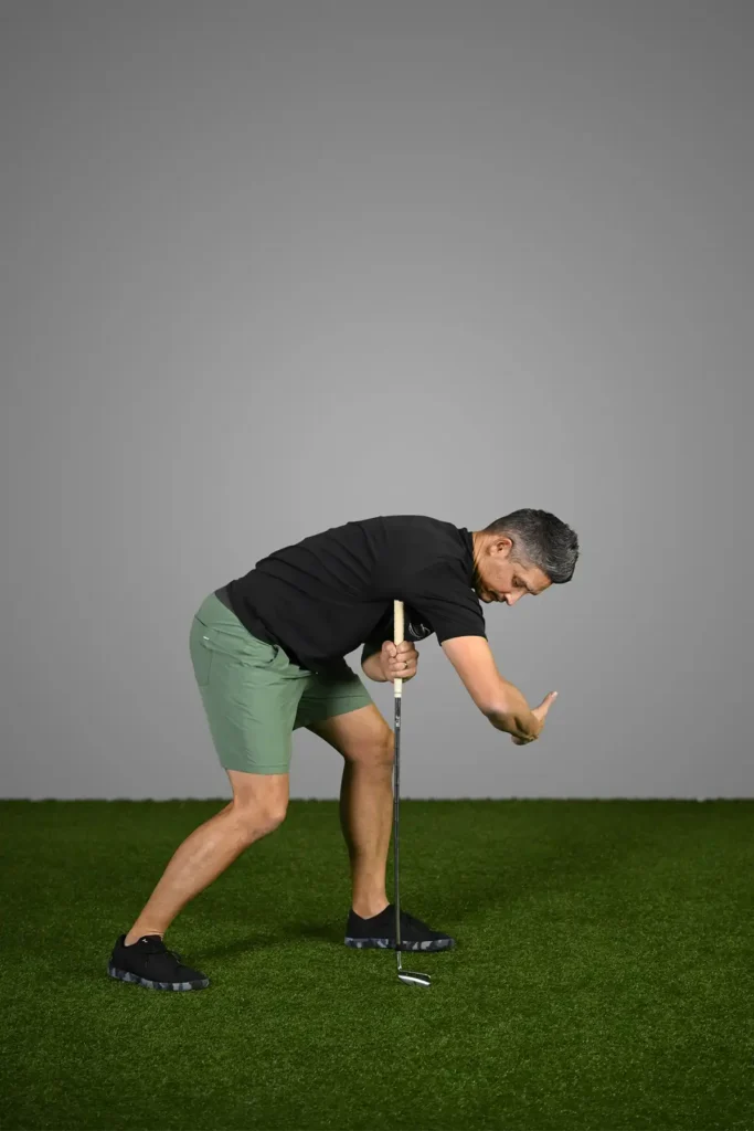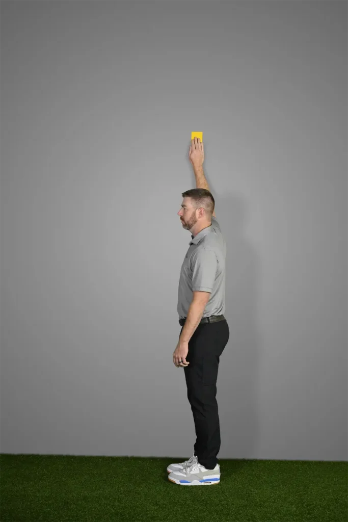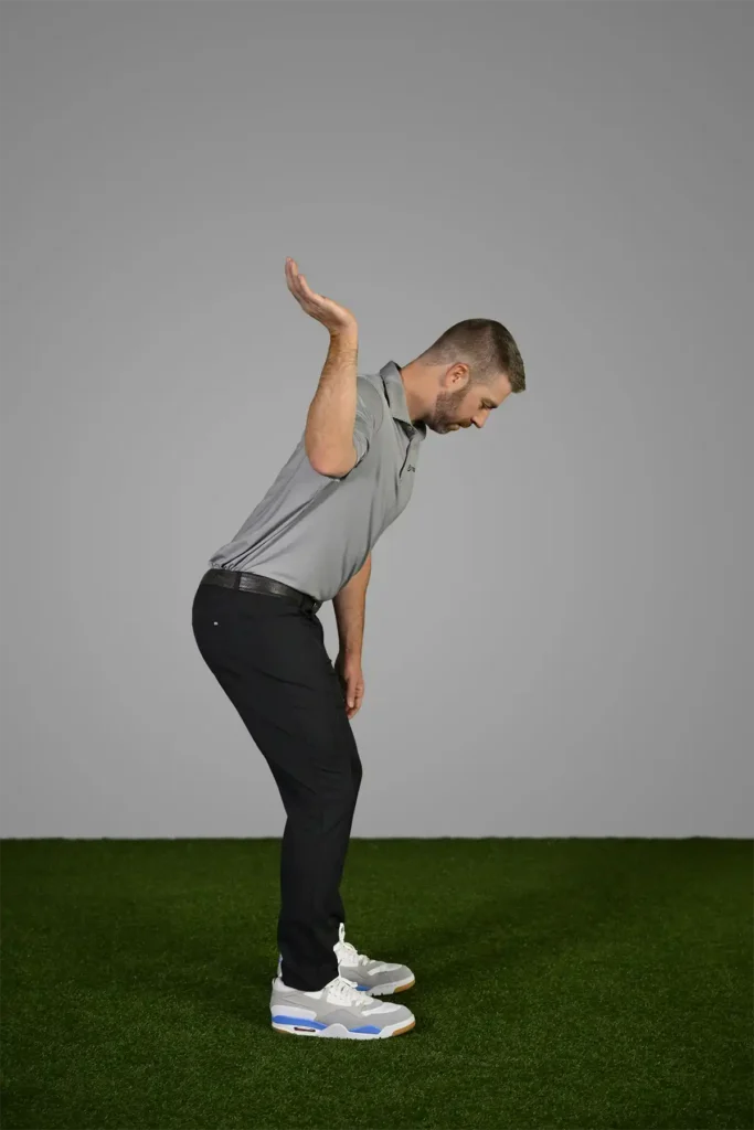 While standing in golf posture, bend one arm 90 degrees at shoulder height and then rotate it upward as much as you can. The goal is to rotate the forearm at least 10 degrees past your spine angle (while remaining in golf posture).