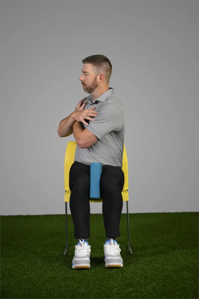 (2) Twists and tilts: These improve spinal mobility and side bending, helping you make a bigger backswing while preventing a flat shoulder turn. Sit in a chair with a yoga block or similar between your knees. With your arms crossed over your chest, rotate your torso in an upright position in either direction and then side bend as shown [above] without losing rotation. With each rep, try to rotate a bit further before bending. Stop when you can’t turn any further. Do several reps in both directions.
