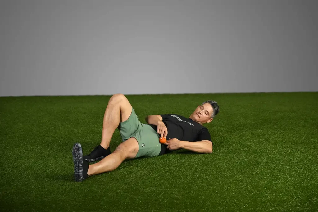(1) TFL tissue releases: The tensor fasciae latae (TFL) is a small muscle at the top of your thighs that unlocks hip internal rotation – key for coiling into your trail leg in the backswing, posting on the lead side in the downswing and protecting your low back. Pin a firm ball into the front side of your hip crease [above left and right] and then roll onto it. Apply 30-to-60 seconds of pressure while breathing. Do this a few times on each side.