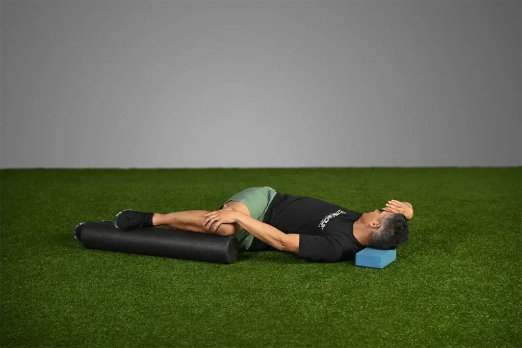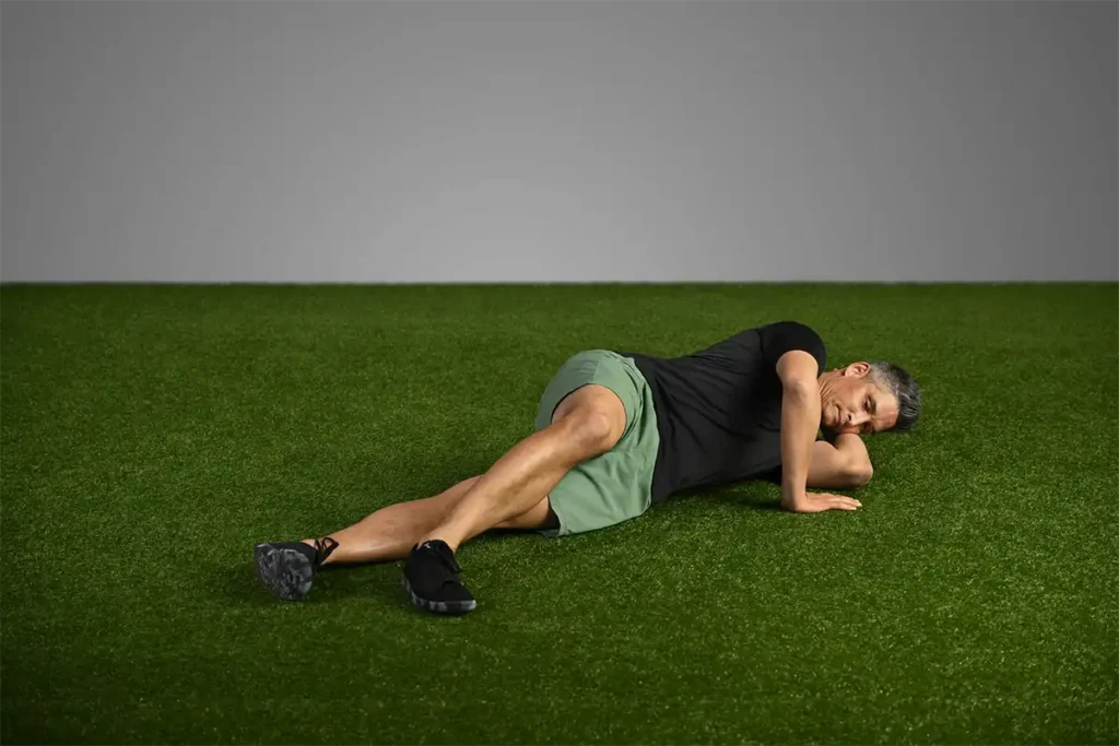 (1) Rib rippers: Isolating movement in the mid back and opening the ribcage while keeping the lower body stable is key to making a full turn and bombing it. Lie on your side with the top leg bent 90 degrees and resting on a pad. Hold that leg’s knee down while you rotate your torso away from it and breathe in [above]. Try to rotate a little further as you exhale. Do several reps, flip over, and do more in the opposite direction.