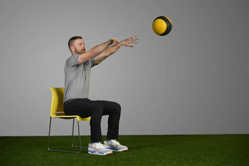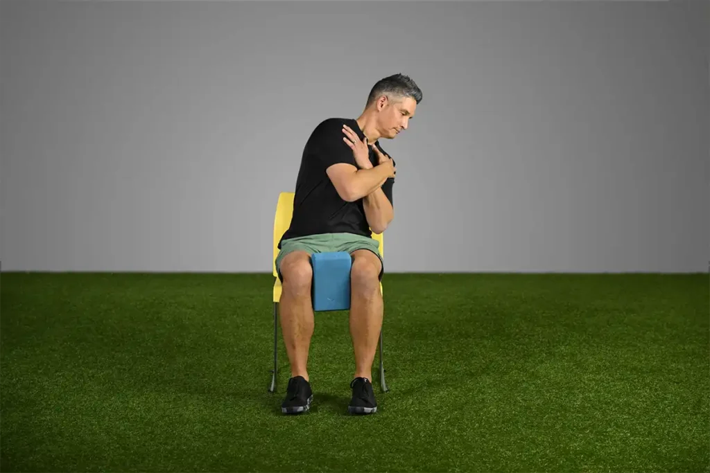 Sitting upright in a chair with your knees pinching a soft object like a yoga block, cross your arms over your chest and rotate your torso in either direction. The passing goal is at least 60 degrees of rotation without leaning or shifting with your lower body.