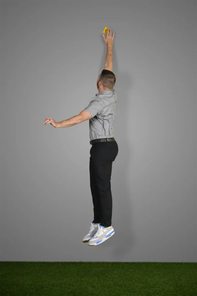 Measure how high you can jump and how far you can chest pass a medicine ball at the beginning and end of this program to get an a real sense of how much further you should be driving the ball. With the chest pass, use a two-kilogram ball and launch it at roughly a 45-degree angle forward. With the vertical leap [below], stick a sticky note as high as you can while standing and then jump and post another note to mark the difference. Your passes and jumps will improve by the end of this program if you routinely do the exercises on these.