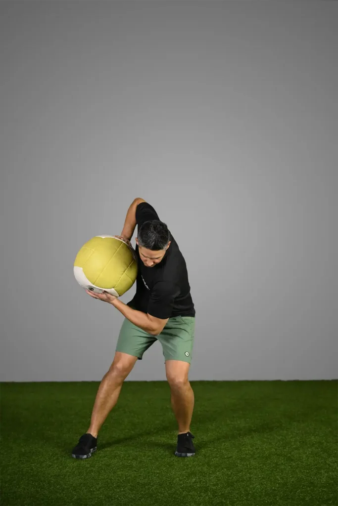 (1) Rotary med-ball slams: These train the sequence of pushing off the lead leg and transferring power from the body to the club. Holding a soft and light med ball in a backswing-like position, push hard into the ground and then rotate your body as if making a through-swing while firing the ball straight down [above]. Do several forceful reps in each direction.
