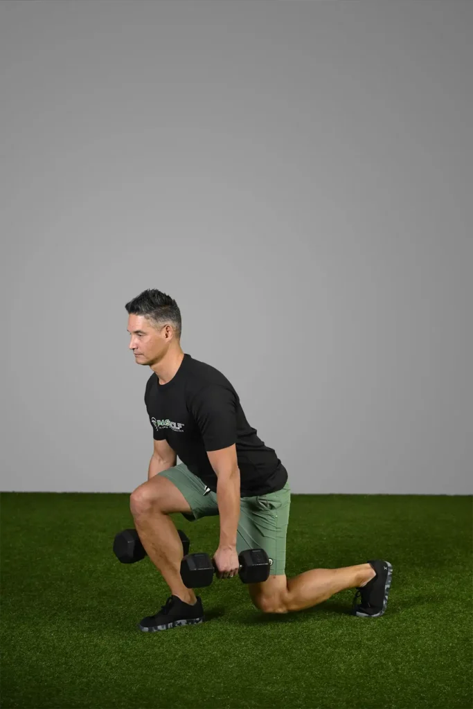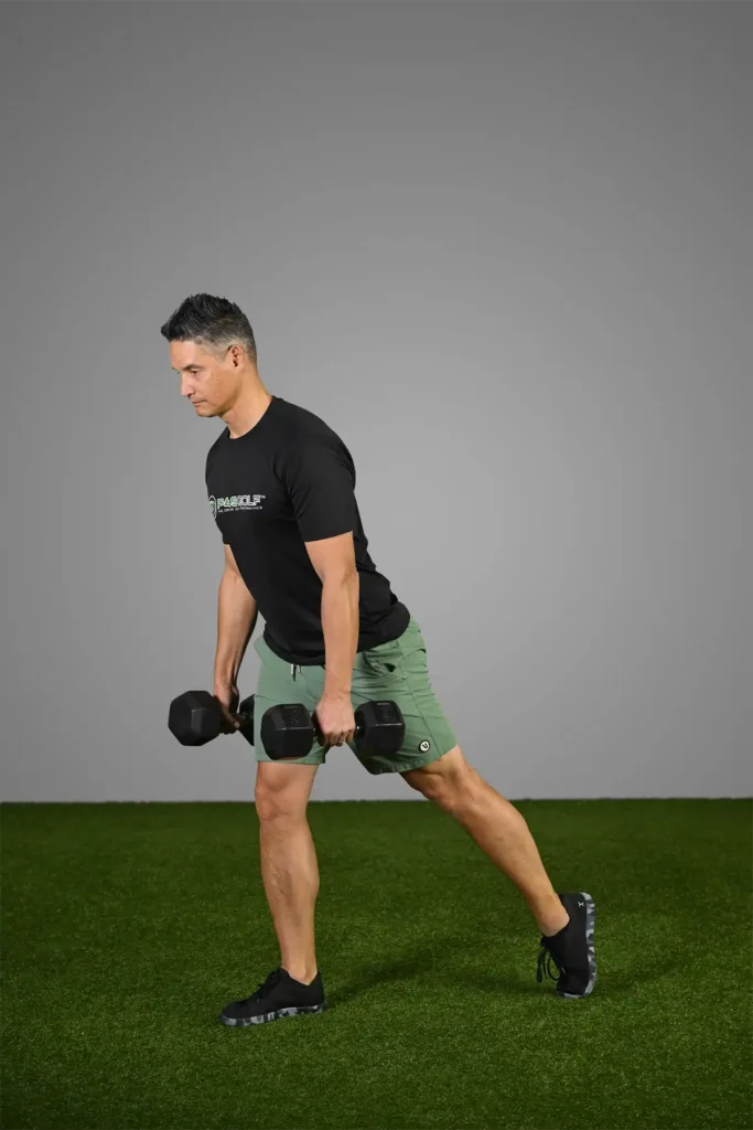 (2) Eccentric dumbbell split squats: Stronger legs allow you to leverage ground forces better – and that’s a real speed accumulator in golf. From a split stance while holding dumbbells at your sides, take several seconds to lower into a squat, then drive hard through the front foot up to the start position [above]. Do