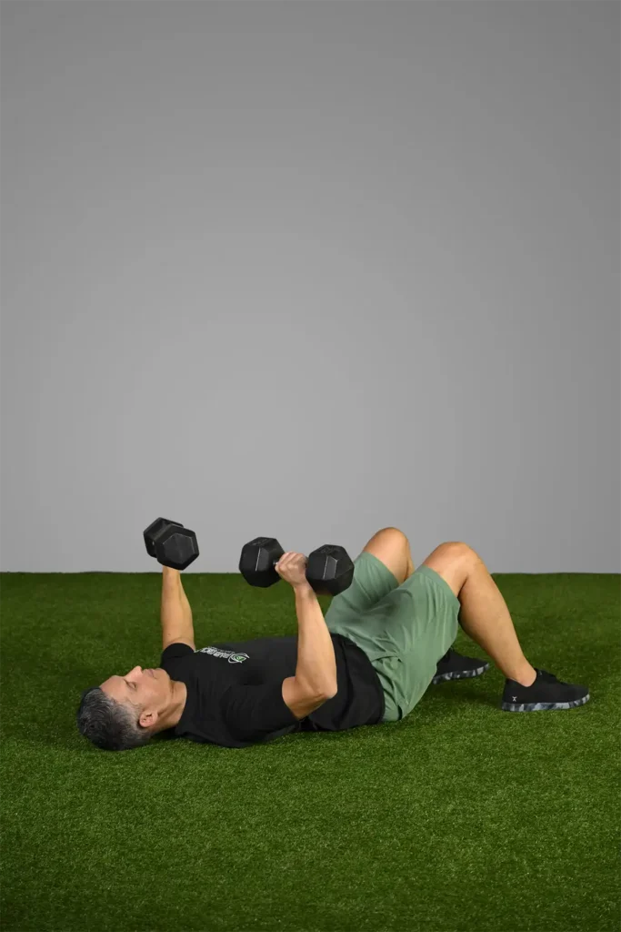 (1) Eccentric dumbbell floor presses: Stronger chest muscles will boost your downswing speed. Laying supine with your knees bent, lower dumbbells of a challenging weight slowly until your elbows tap the floor, then press up forcefully [above]. Do several reps.