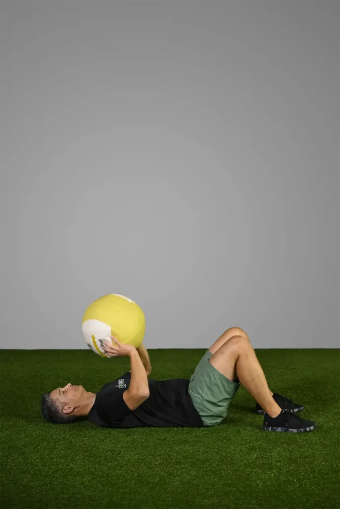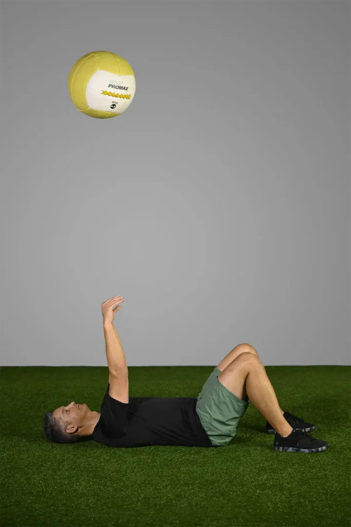 (2) Supine med-ball drop passes: These train the trunk to produce more speed, not just power. Fire a soft, light med ball upward powerfully and catch it as it falls [above]. Do each rep without pausing, focusing on explosive movement. Do several reps. Work on this program as part of your existing routine or as the foundation for a new one. Do the exercises at least a few times each week. Some of our middle-aged clients who have gone through this are now driving it further than they did in their 30s!