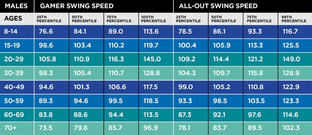 all-out speeds. For example, if you’re in the 50-59 age group and swing 95mph on the course and 98 on a simulator or range, you’re in the 50th percentile.