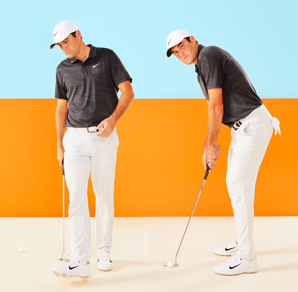 I break a putt into thirds and read each segment separately, paying most attention to the segment closest to the hole [above left]. Why the last third? When the ball slows down, it reacts the most to slope. Also, by reading a green this way, I can see the full picture of the route the ball will take to the hole. I find it’s much more reliable than just picking out a spot on the green where the putt will break. When you do that, you often unconsciously cheat your body towards the hole and then your alignment won’t match your read. I want to make sure my arms and feet are parallel to the putt’s start line, and my knees have some flex to take tension off my upper body [above right].