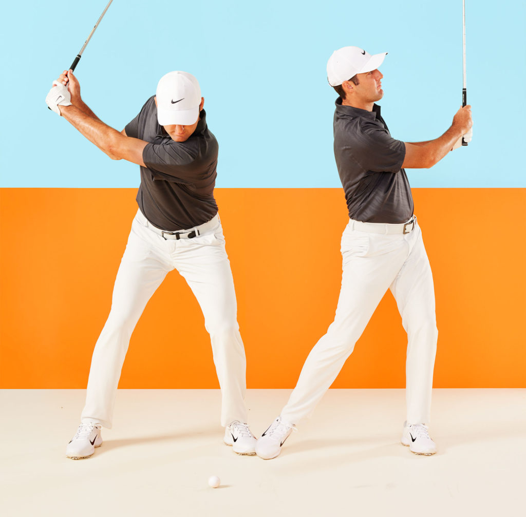 A good setup for me – and for you – is to get my hips over my knees, and tilt my belt and shoulders slightly up [above left]. From that more balanced address position, I can easily turn into my right hip socket and load onto my right leg [above right]. When you turn instead of slide, you can get your hands deeper and farther away from the centre of your chest – and you have more room and time to swing down with speed.