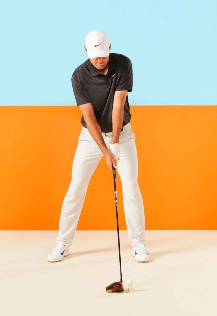 To play my low cut, choke down on the handle slightly and move a hair closer to a ball teed very low. This will make your swing more vertical [above] and the attack angle more vertical like when you hit a hybrid. You might even take a small scuff of a divot. Adjusting your ball position will influence shot shape. I fade it from a mid-stance position, but when I play it back and swing more to the right, I’ll hit a low trap draw instead. You might see that at the Open Championship next month.