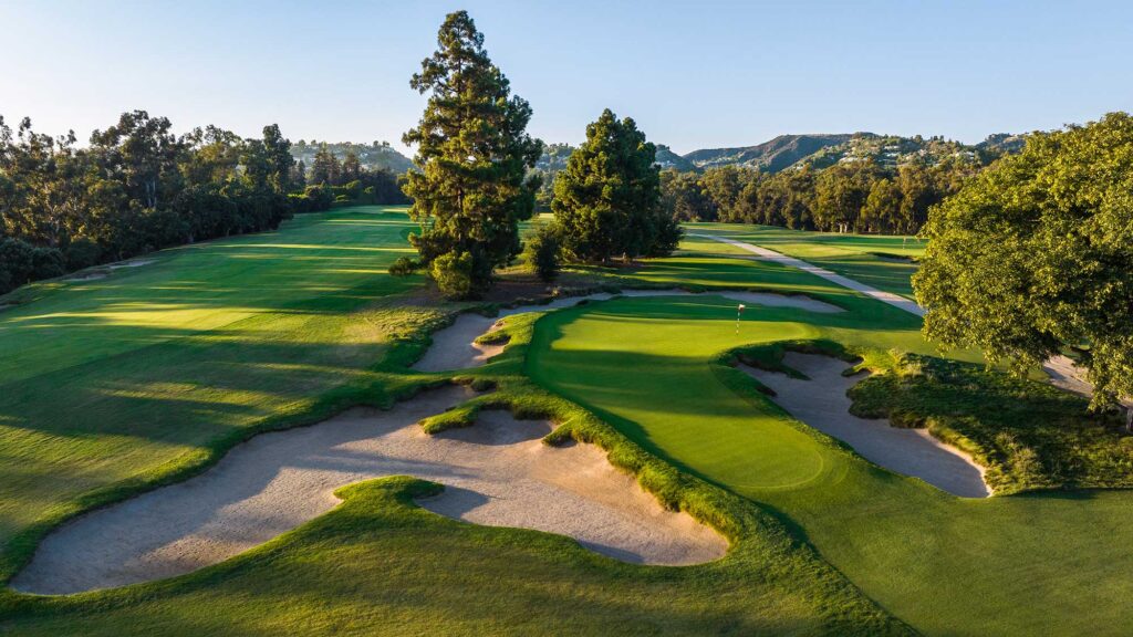 Architecturally, if not in tournament clout, Bodenhamer is correct. The North course, 16th on the Golf Digest America’s 100 Greatest Courses ranking, is one of the great triumvirate of courses George Thomas designed in Los Angeles in the 1920s, with Riviera and Bel-Air Country Club, each built with William P. (Billy) Bell. Thomas’ genius was his ability to design strategically complex holes on distinctly different sites. He was a master at incorporating natural terrain and grade changes when available and constructing elaborate bunkers and other architectural apparatuses when not. In the canyons of Bel-Air he routed the holes the only places he could – in the valleys – but used the foothill slopes and shoulders to exciting effect (the financial luxury to link the disparate sections via tunnels and elevators inside mountains plus a suspension bridge over the top certainly helped). At Riviera he could route the holes any way he wanted over a largely featureless plain between two palisades, using a barranca and manufactured features to create the course’s strategic compositions. Los Angeles Country Club falls in between.